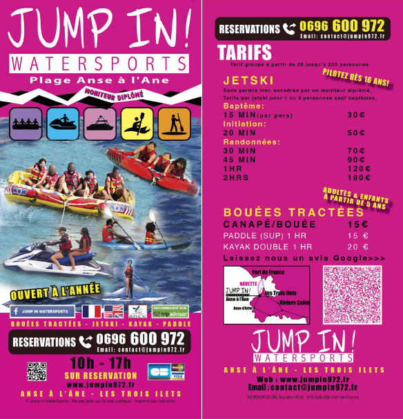 Base nautique multi-activités sud Martinique, bouée et canapé tractés, randonnées et initiations en jet-ski (avec ou sans permis) avec comme parcours Îlet Ramiers, la grotte de chauve-souris, Anse Noire, Anse Dufour, Les Anses d’Arlet, le Rocher du Diamant. Paddle et kayak à Anse à l’Ane, Les Trois Ilets, Martinique. Pilotez dès 16 ans avec ou sans permis !
