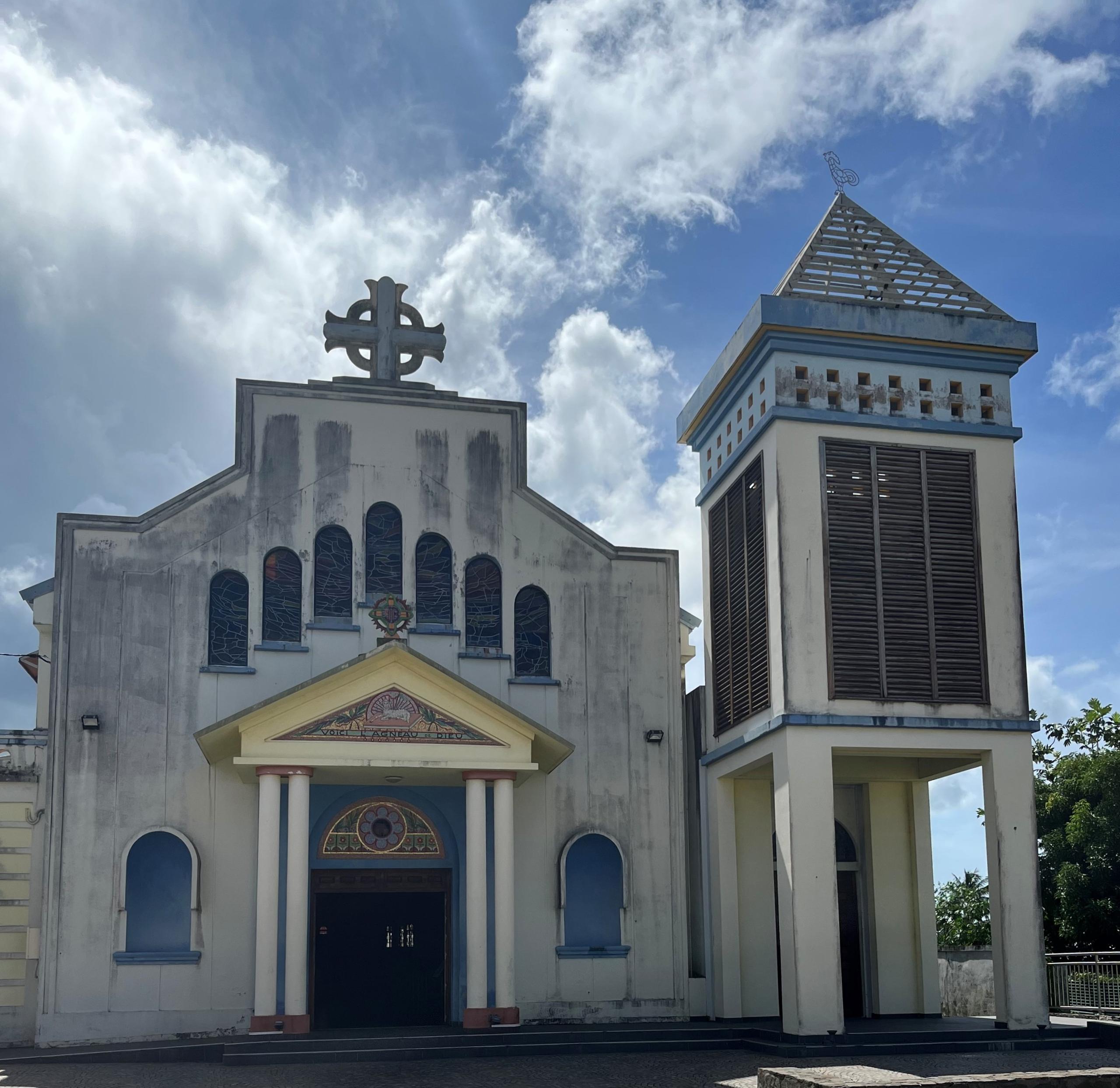 Fondée en 1716, elle a été reconstruite à plusieurs reprises, notamment après le cyclone Dean et le tremblement de terre de 2007. Sa façade moderne inaugurée en 2011 allie tradition et modernité. Son clocher unique percé de claustras. est remarquable.